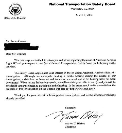 - Letter to the Witness Group from NTSB Chairman, Marion